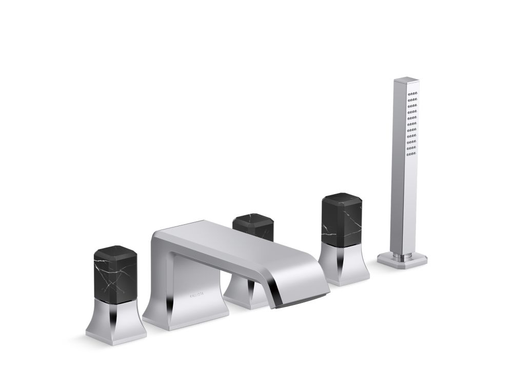 Showcasing Kallista’s first soft square profile intricately faceted in the likeness of a gem stone, the Bezel™ collection features an Art Deco-inspired silhouette, elevated natural stone adornments and a precision cut contour tempered by classical composition. The result is a luxurious, versatile and classic aesthetic, developed to endure the test of time. Kallista is proud to introduce Bezel™ in partnership with Italian manufacturer CRISTINA Rubinetterie and creative industrial design team Busetti Garuti Redaelli. A distinguishing focal point for the discerning eye, this deckmounted bath faucet with handshower and diverter, adorned with striking Italian Nero Marquina natural stone handles, is the ultimate statement in both stature and refined detail. Due to the natural properties of the stone, coloring may vary.- High-quality solid-brass construction for durability and reliability