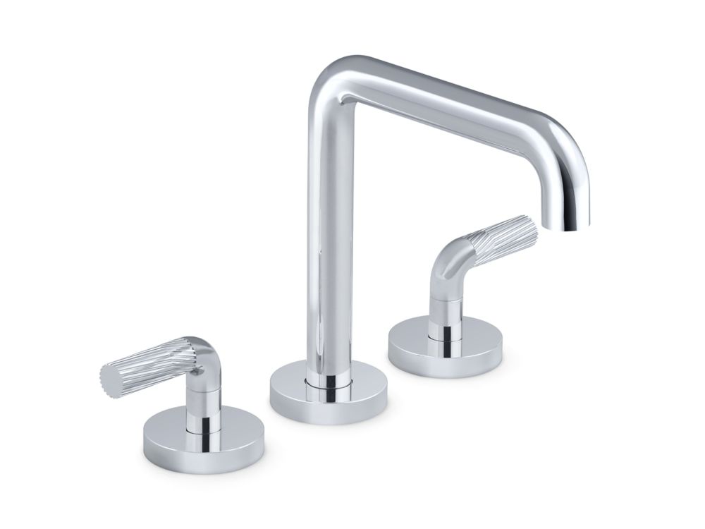 Designed for the contemporary or transitional bathroom, this premium deck-mount bathtub faucet pairs Armory decorative handles and a tall, sleek spout with rounded angles. The Armory handle captures the poetics of motion in machine-etched lines, which combines perfectly with the One™ collection’s polished aesthetic. Unique patterning merges detail with texture to dynamic effect, recalling Art Deco’s celebration of applied art through a modern lens.- Sleek contemporary design