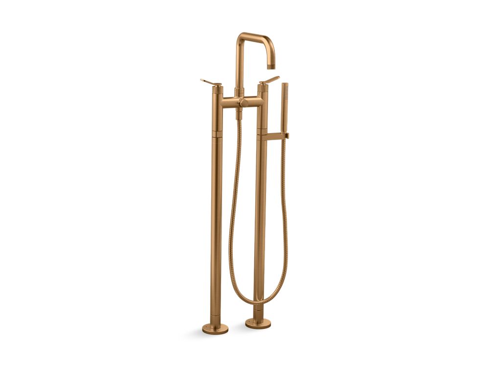 Modern American style meets sleek European form in the all-brass Aileron™ collection. Minimalist lines, distinctive knurling texture and handcrafted character make this series suitable for any contemporary or transitional environment. Paying homage to aeronautical design, Aileron™ features thoughtful details including a slender tube spout, winged handle set, and finial-adorned levers. Kallista is proud to introduce Aileron™ in partnership with Italian manufacturer CRISTINA Rubinetterie and creative industrial design team Silvana Angeletti and Daniele Ruzza. As a declaration in American Contemporary design, this Aileron™ Freestanding bath faucet with included handshower is a captivating addition to any modern bathroom aesthetic.- High-quality solid-brass construction for durability and reliability