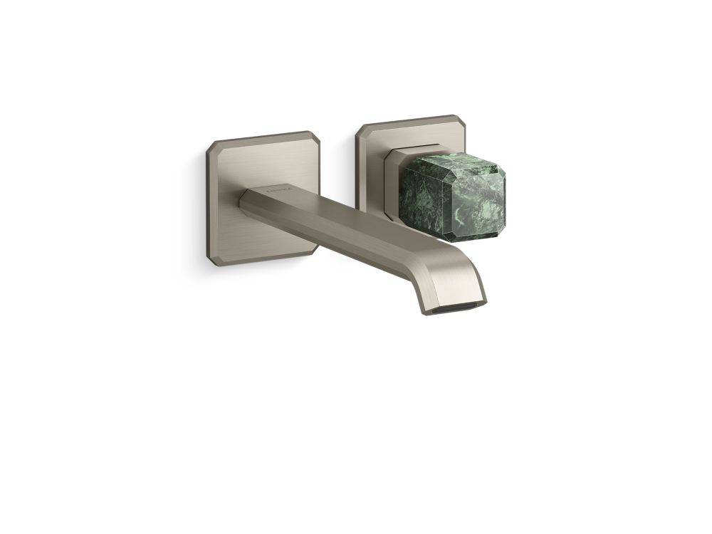 Showcasing Kallista’s first soft square profile intricately faceted in the likeness of a gem stone, the Bezel™ collection features an Art Deco-inspired silhouette, elevated natural stone adornments and a precision cut contour tempered by classical composition. The result is a luxurious, versatile and classic aesthetic, developed to endure the test of time. Kallista is proud to introduce Bezel™ in partnership with Italian manufacturer CRISTINA Rubinetterie and creative industrial design team Busetti Garuti Redaelli. A distinguishing focal point for the discerning eye, this wall mounted single control sink faucet with elongated spout, adorned with a striking Guatemala natural stone handle, is the ultimate statement in both stature and refined detail. Due to the natural properties of the stone, coloring may vary.