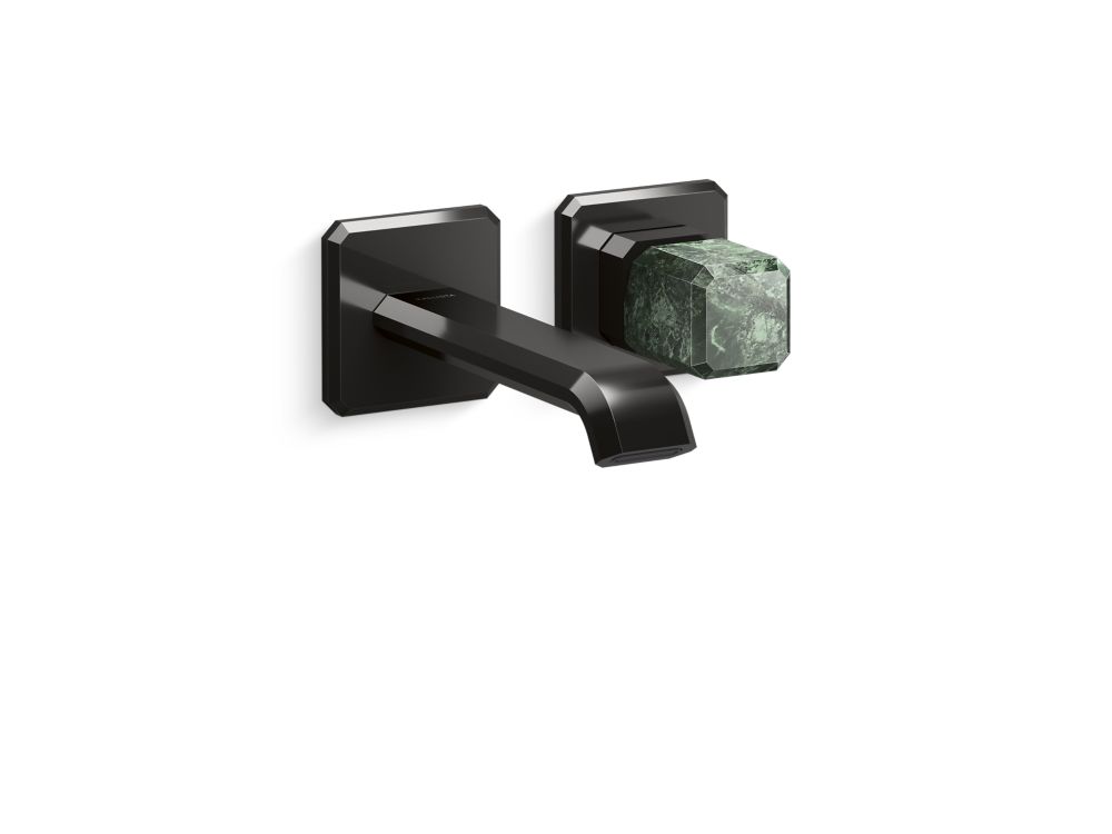 Showcasing Kallista’s first soft square profile intricately faceted in the likeness of a gem stone, the Bezel™ collection features an Art Deco-inspired silhouette, elevated natural stone adornments and a precision cut contour tempered by classical composition. The result is a luxurious, versatile and classic aesthetic, developed to endure the test of time. Kallista is proud to introduce Bezel™ in partnership with Italian manufacturer CRISTINA Rubinetterie and creative industrial design team Busetti Garuti Redaelli. A distinguishing focal point for the discerning eye, this wall mounted single control sink faucet, adorned with a striking green Guatemala natural stone handle, is the ultimate statement in both stature and refined detail. Due to the natural properties of the stone, coloring may vary.- High-quality solid-brass construction for durability and reliability