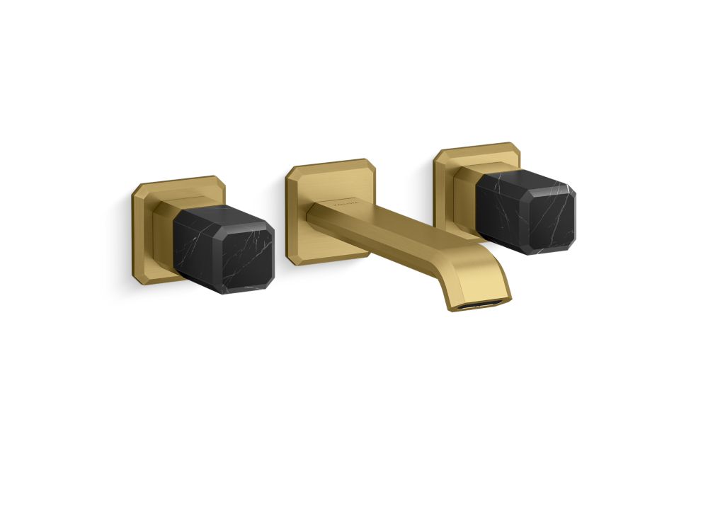 Showcasing Kallista’s first soft square profile intricately faceted in the likeness of a gem stone, the Bezel™ collection features an Art Deco-inspired silhouette, elevated natural stone adornments and a precision cut contour tempered by classical composition. The result is a luxurious, versatile and classic aesthetic, developed to endure the test of time. Kallista is proud to introduce Bezel™ in partnership with Italian manufacturer CRISTINA Rubinetterie and creative industrial design team Busetti Garuti Redaelli. A distinguishing focal point for the discerning eye, this wall mount widespread sink faucet, adorned with striking Italian Nero Marquina natural stone handles, is the ultimate statement in both stature and refined detail. Due to the natural properties of the stone, coloring may vary.- High-quality solid-brass construction for durability and reliability