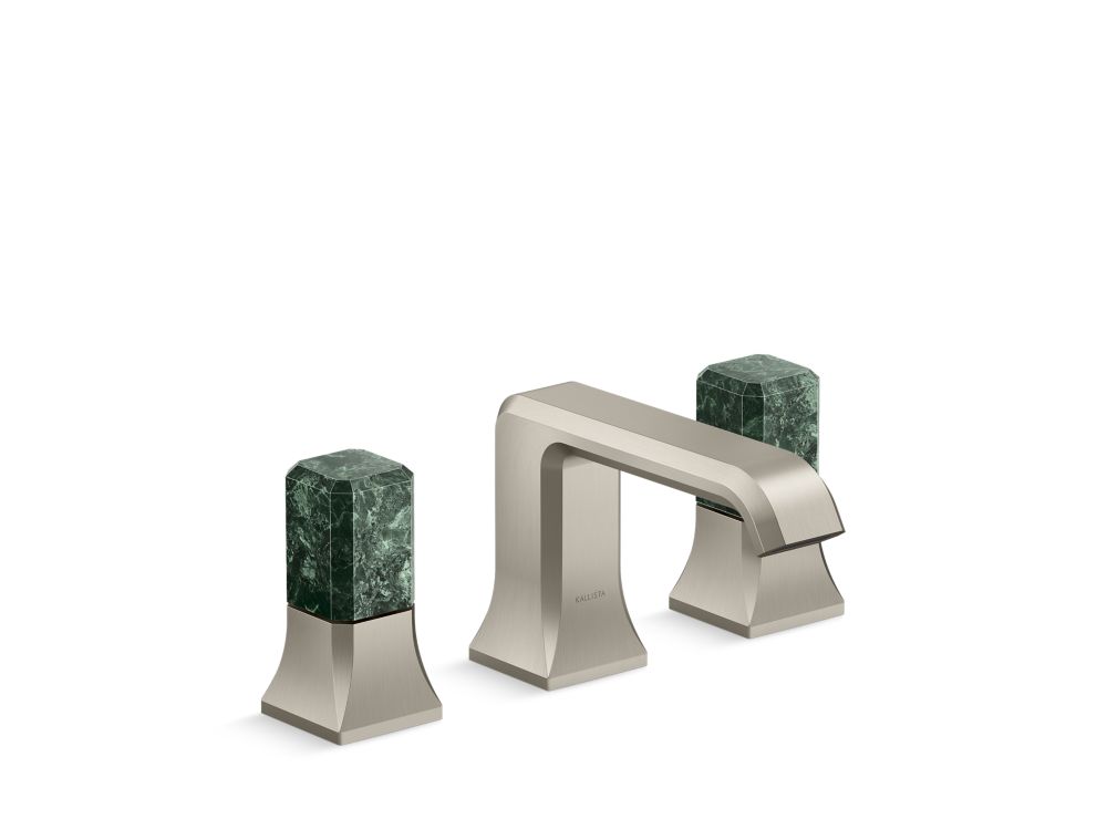 Showcasing Kallista’s first soft square profile intricately faceted in the likeness of a gem stone, the Bezel™ collection features an Art Deco-inspired silhouette, elevated natural stone adornments and a precision cut contour tempered by classical composition. The result is a luxurious, versatile and classic aesthetic, developed to endure the test of time. Kallista is proud to introduce Bezel™ in partnership with Italian manufacturer CRISTINA Rubinetterie and creative industrial design team Busetti Garuti Redaelli. A distinguishing focal point for the discerning eye, this widespread sink faucet adorned with striking green Guatemala natural stone handles, is the ultimate statement in both stature and refined detail. Due to the natural properties of the stone, coloring may vary.- High-quality solid-brass construction for durability and reliability