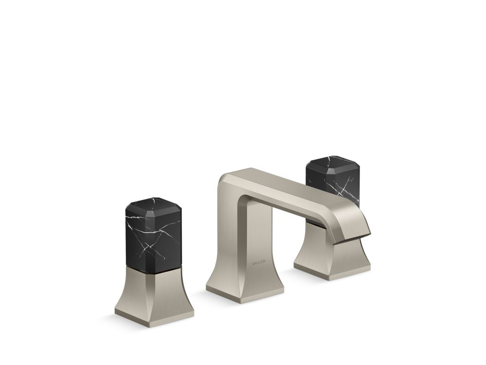 Showcasing Kallista’s first soft square profile intricately faceted in the likeness of a gem stone, the Bezel™ collection features an Art Deco-inspired silhouette, elevated natural stone adornments and a precision cut contour tempered by classical composition. The result is a luxurious, versatile and classic aesthetic, developed to endure the test of time. Kallista is proud to introduce Bezel™ in partnership with Italian manufacturer CRISTINA Rubinetterie and creative industrial design team Busetti Garuti Redaelli. A distinguishing focal point for the discerning eye, this widespread sink faucet adorned with Italian Nero Marquina natural stone handles, is the ultimate statement in both stature and refined detail. Due to the natural properties of the stone, coloring may vary.- High-quality solid-brass construction for durability and reliability