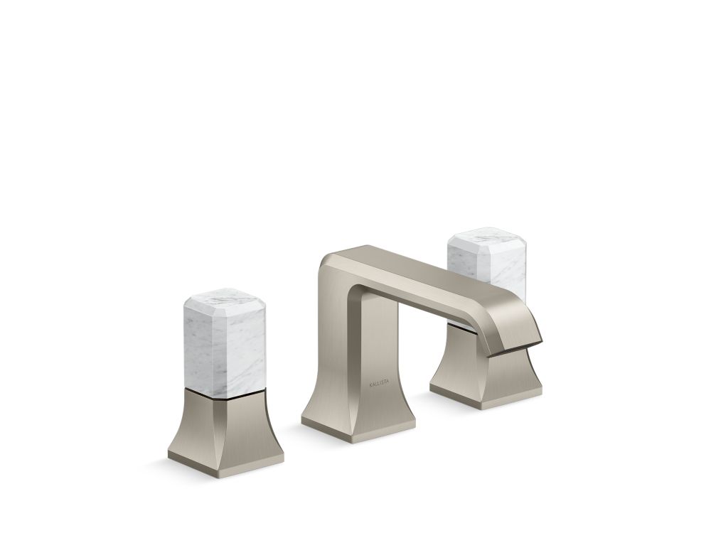 Showcasing Kallista’s first soft square profile intricately faceted in the likeness of a gem stone, the Bezel™ collection features an Art Deco-inspired silhouette, elevated natural stone adornments and a precision cut contour tempered by classical composition. The result is a luxurious, versatile and classic aesthetic, developed to endure the test of time. Kallista is proud to introduce Bezel™ in partnership with Italian manufacturer CRISTINA Rubinetterie and creative industrial design team Busetti Garuti Redaelli. A distinguishing focal point for the discerning eye, this widespread sink faucet adorned with Italian statuary White Carrara natural stone handles, is the ultimate statement in both stature and refined detail. Due to the natural properties of the stone, coloring may vary.- High-quality solid-brass construction for durability and reliability