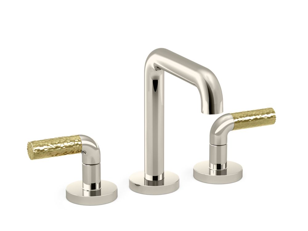 With sleek form and distinctive details, the premium bathroom sink faucet by the One Decorative collection makes a statement in any modern bathroom. Hand-hammered P.E. Guerin handles bring rich detailing to the faucet's minimalist beauty.