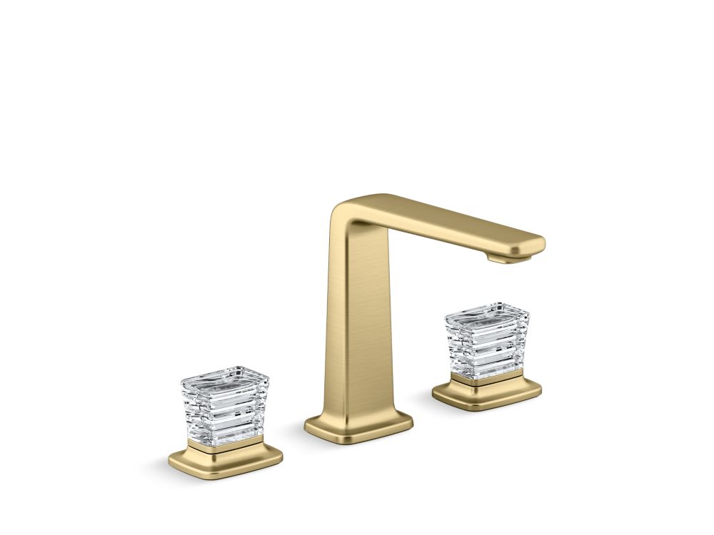 The premium Per Se Decorative bathroom sink faucet features a slender profile and soft curves that embrace modern minimalism. An exquisite work of art, featuring hand-cut, ribbed Saint-Louis Crystal handles and a tall, sleek spout, this luminous widespread faucet makes a statement in any contemporary or transitional bathroom space.- Hand-cut French crystal knobs by Saint-Louis