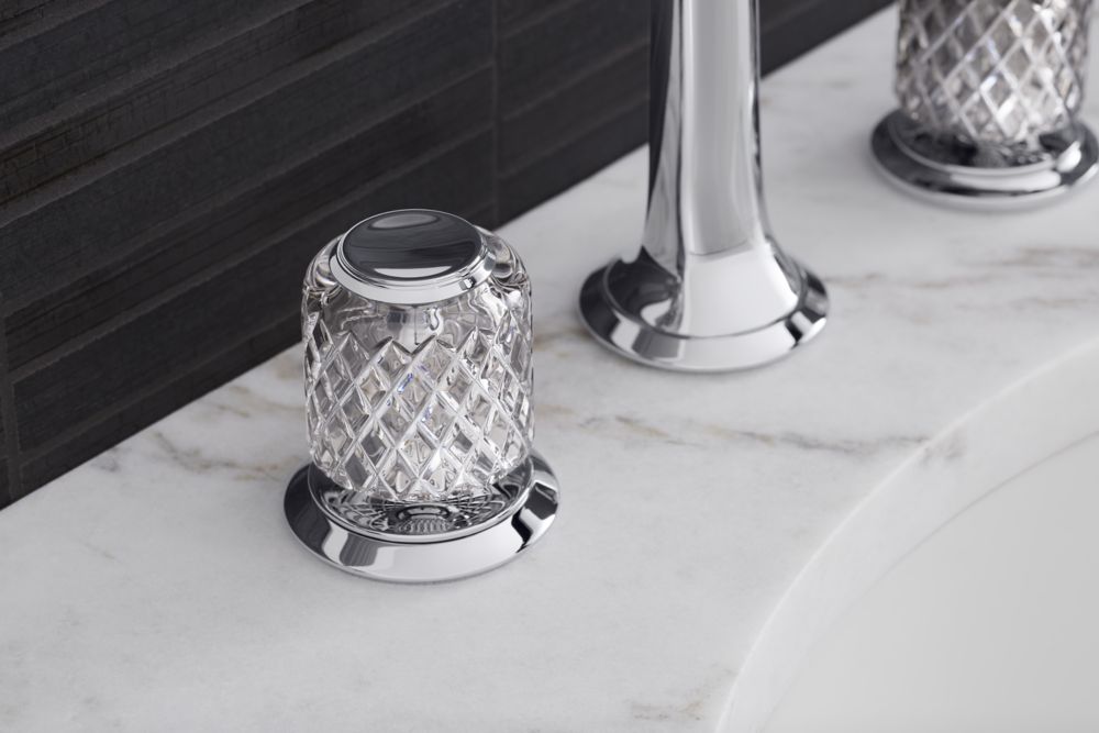 Accented with luminous crisscross-etched clear crystal from esteemed French crystallerie Saint-Louis, the strikingly approachable Script Decorative sink faucet with knob handles and arch spout offers unparalleled elegance, artisan craftsmanship, and exquisite materials to elevate your everyday use. The decadent widespread faucet was designed to make a statement in any traditional or transitional bathroom space.- Hand-cut French crystal knobs by Saint-Louis