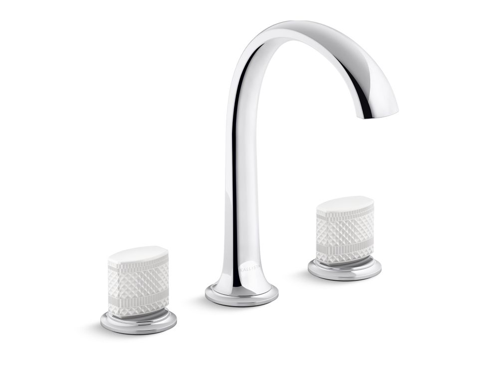 Bringing unique style to your bathroom space, the Script Decorative sink faucet with arch spout and knob handles offers a sense of elegance while maintaining artistic integrity. Sleek White Porcelain knob handles feature an intricate crisscross pattern, inspired by artisan microfacets in craft furnishings, fashion, and jewelry. Elevate your everyday with this luxurious widespread bathroom sink faucet.- Handcrafted porcelain handles