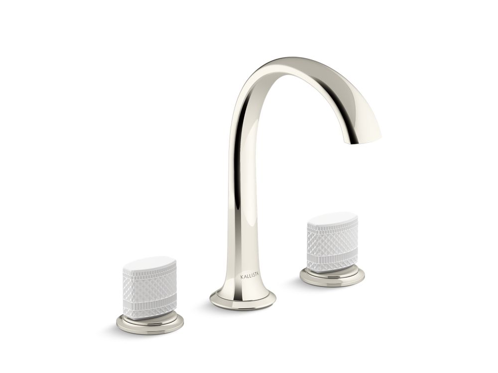 Bringing unique style to your bathroom space, the Script Decorative sink faucet with arch spout and knob handles offers a sense of elegance while maintaining artistic integrity. Sleek White Porcelain knob handles feature an intricate crisscross pattern, inspired by artisan microfacets in craft furnishings, fashion, and jewelry. Elevate your everyday with this luxurious widespread bathroom sink faucet.- Handcrafted porcelain handles