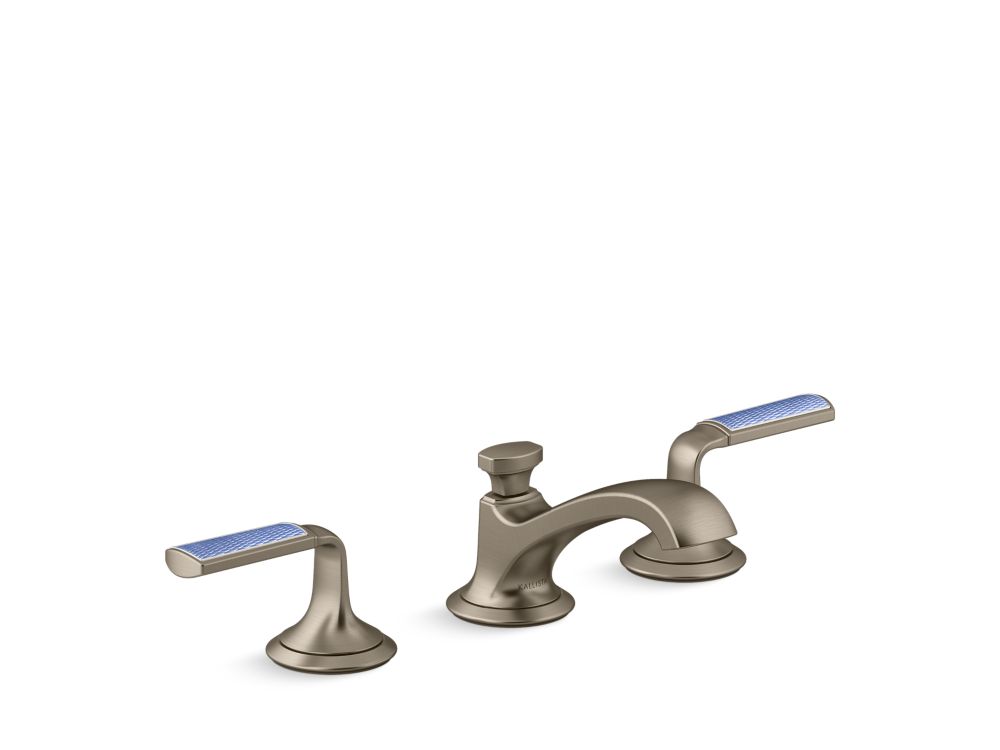 Hand-painted enamel accents swirl around lever handles in a calming wave pattern, ensuring the artisan craftsmanship of the Script Decorative sink faucet shines in any bathroom setting. The delicate and calming Celeste Blue enamel adornments are made using the historic art of guilloche. Elevate your everyday with this unique, luxurious widespread sink faucet with low spout.- Handcrafted fired enamel handle insert with Wave pattern