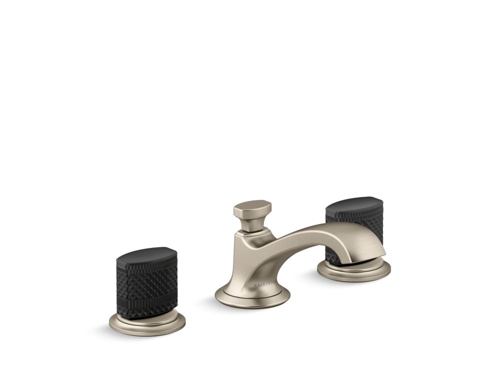 Bringing unique style to your bathroom space, the Script Decorative sink faucet with low spout and knob handles offers a sense of elegance while maintaining artistic integrity. Sleek Matte Black Porcelain knob handles feature an intricate crisscross pattern, inspired by artisan microfacets in craft furnishings, fashion, and jewelry. Elevate your everyday with this luxurious widespread bathroom sink faucet.- Handcrafted porcelain handles