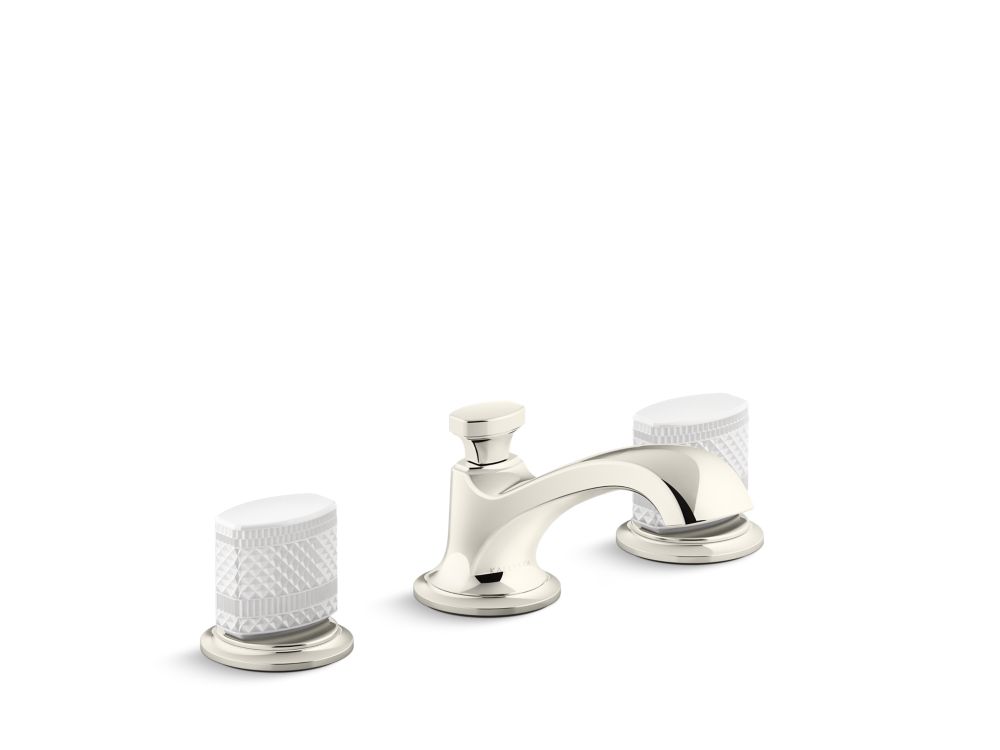 Bringing unique style to your bathroom space, the Script Decorative sink faucet with low spout and knob handles offers a sense of elegance while maintaining artistic integrity. Sleek White Porcelain knob handles feature an intricate crisscross pattern, inspired by artisan microfacets in craft furnishings, fashion, and jewelry. Elevate your everyday with this luxurious widespread bathroom sink faucet.- Handcrafted porcelain handles
