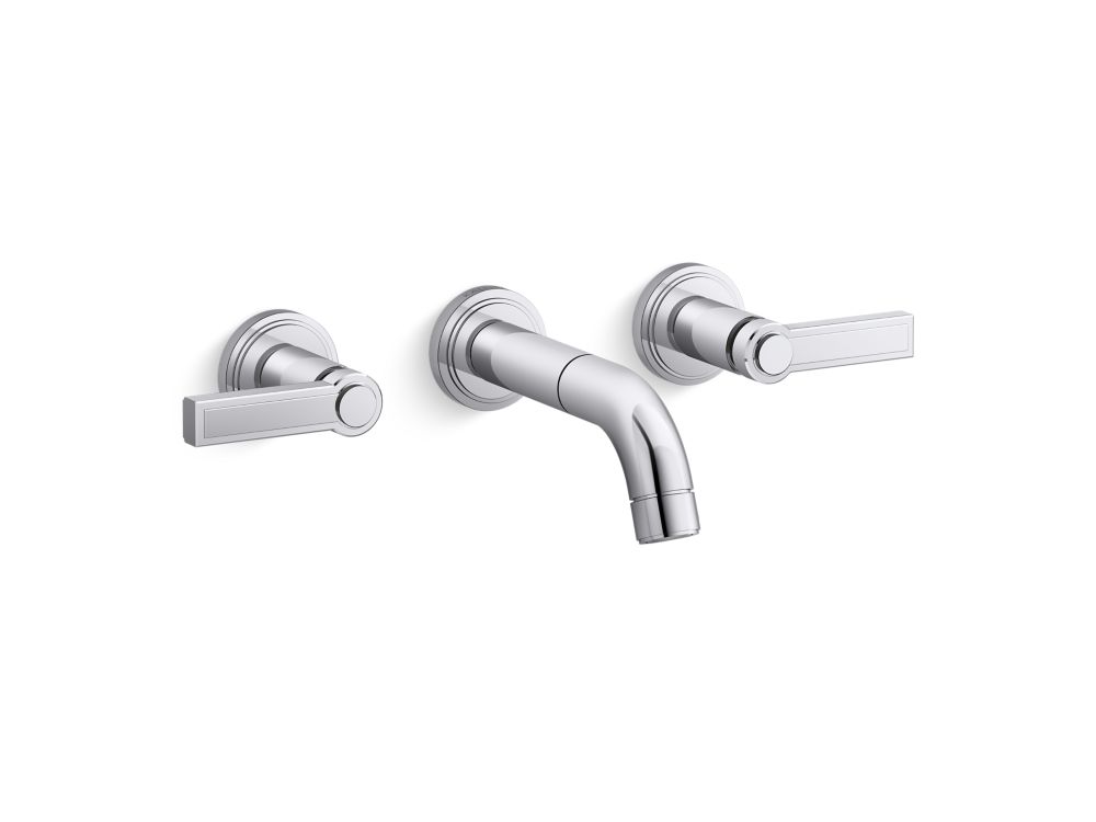 With a sleek cylindrical spout and lever handles, the Vir Stil Minimal wall-mount sink faucet is an eye-catching addition to the modern bathroom. Vir Stil Minimal is a collection of pared-down Bauhaus-inspired modern classics designed by acclaimed artist and designer Laura Kirar. Sharing architectural inspiration with the Vir Stil classic collection – single controls, lever handles and stepped escutcheons – Vir Stil Minimal explores tubular shapes and smooth as opposed to fluted details, distilling the aesthetic down to its essence. Here, a purity of form serves to underscore luxurious materials and rich finishes, revealing their intention and elevating their impact. This collection is intended for full bathroom specification, including sink and tub faucets, floor-mounted tub filler, shower fixtures and accessories, as well as a pull-down faucet and bar/entertainment faucet for kitchen use.