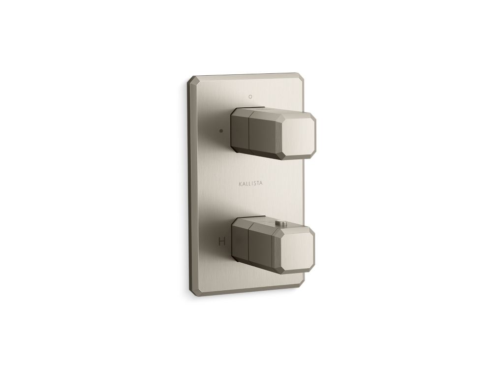 Showcasing Kallista’s first soft square profile intricately faceted in the likeness of a gem stone, the Bezel™ collection features an Art Deco-inspired silhouette with a precision cut contour tempered by classical composition. The result is a luxurious, versatile and classic aesthetic, developed to endure the test of time. Kallista is proud to introduce Bezel™ in partnership with Italian manufacturer CRISTINA Rubinetterie and creative industrial design team Busetti Garuti Redaelli. A distinguishing focal point for the discerning eye, this Stacked Thermostatic shower trim with 2 outlet eco diverting is the ultimate statement in both stature and refined detail.- High-quality solid-brass construction for durability and reliability