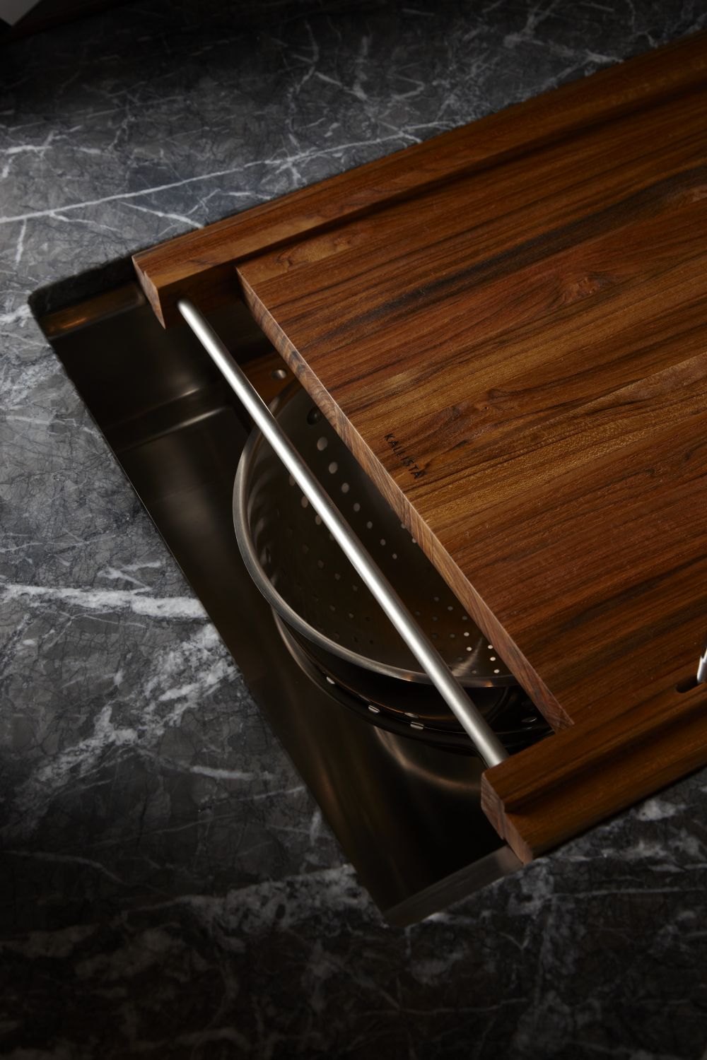 - Includes colander holder, flatware tray, and teak cutting board with sharpener