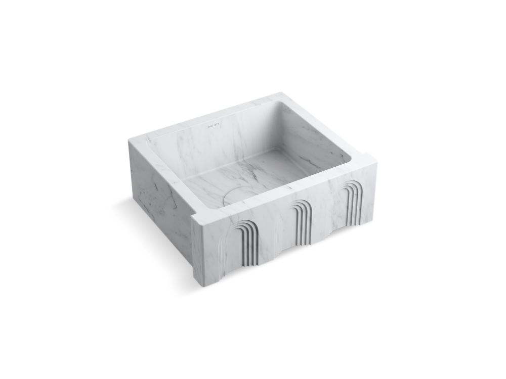Architectural in form and deliberate in scale, the Voussoir™ collection is designed as the focal point of the kitchen and its adjacent spaces. Each sink is carved from a single block of stone, revealing depth, curvature, and the strength of monolithic construction. Designed by Richard T. Anuszkiewicz, Voussoir™ reflects a modern respect for heritage forms. Precision carving, expressive curves, and distinctive stone come together to create a sink that feels both artful and enduring. With it's statement apron-front design, this generously sized 24" sink is intended to anchor the luxury kitchen space. Please Note: Due to the rarity and precious nature of the Call-to-Quote Fusion Green Quartzite stone, Kallista requires a 50% down payment at the time of order. The product lead time will begin once payment is received.- Carved from a single block of natural stone, assuring harmonious and natural veining transitions